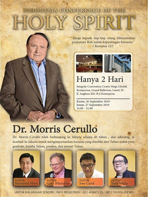 OnlineKristen.Com – Dr Morri Cerullo telah berkunjung ke Jakarta selama 40 tahun. Dia akan kembali ke Jakarta menjadi pembicara utama dan pendoa selama dua hari dalam acara “Indonesia Conference of the Holy Spirit” dari tanggal 26-27 September 2019, pukul 14.00-21.00 WIB di Grand Ball Room, Lantai 10, Integrity Convention Center Mega Glodok Kemayoran, Jakarta.